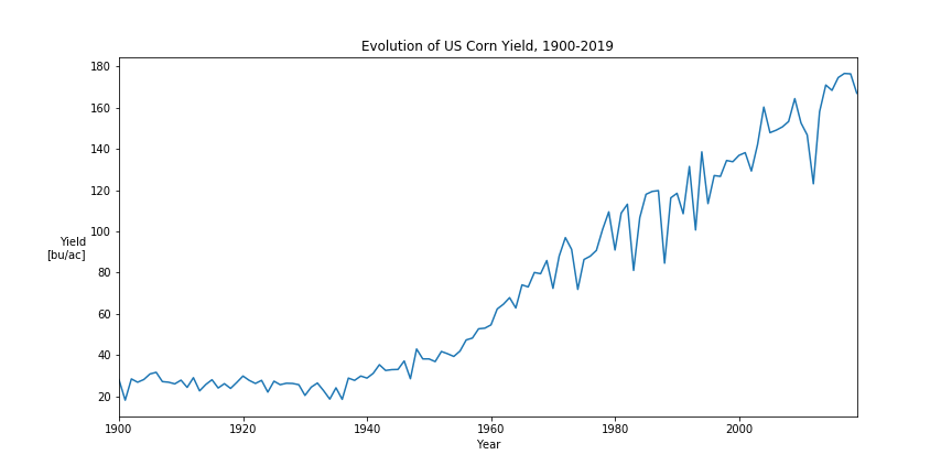 Each color represents one December futures contract. A few things directly jump out: Corn traded consistently between 200 cts/bu and 400 cts/bu from 1988 until 2006. From 2007 – 2014 the prices exploded and traded anywhere between 350 and 800 cts/bu. From 2015 onward prices settled lower again, but still higher than during the pre-2006 era. The large price increases and high volatility of the price between 2007 and 2014 is usually attributed to a combination of adverse weather conditions, ethanol fuel mandates, higher oil prices, the financial crisis, and a generally higher investor interest for commodities.